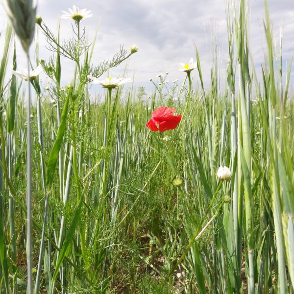 Extensivgetreide mit blühender Untersaat, eine Maßnahme zur Förderung der Artenvielfalt, die auf unserem F.R.A.N.Z. Demonstrationsbetrieb in der Hohenlohe erfolgreich umgesetzt wird.