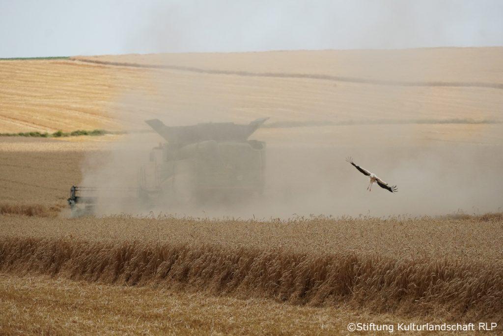 Am 19. Juli 2023 erfolgte der Start in das zweite Versuchsjahr mit der Mähdruschsaat. Hierbei werden unterschiedliche Saatgutmischungen direkt während der Ernte mit dem Mähdrescher ausgebracht und von dem gehäckselten Stroh bedeckt. Unsere Stiftung konnte die Weißstörche und Fasane dabei beobachten, wie sie sich an den aufgescheuchten Insekten und Kleinsäuger bedienten.